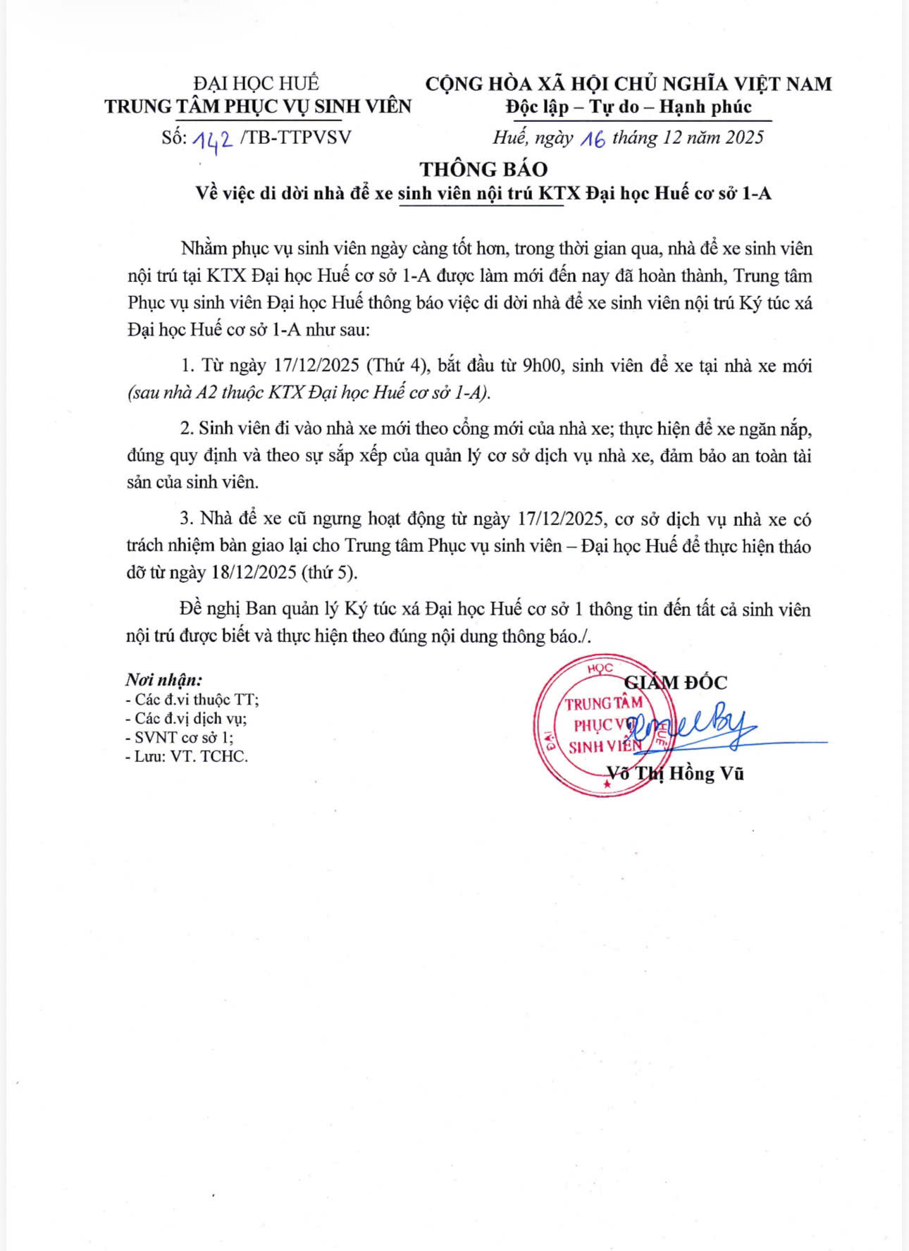 Thông báo về việc di dời nhà để xe sinh viên nội trú KTX Đại học Huế, cơ sở 1 - A