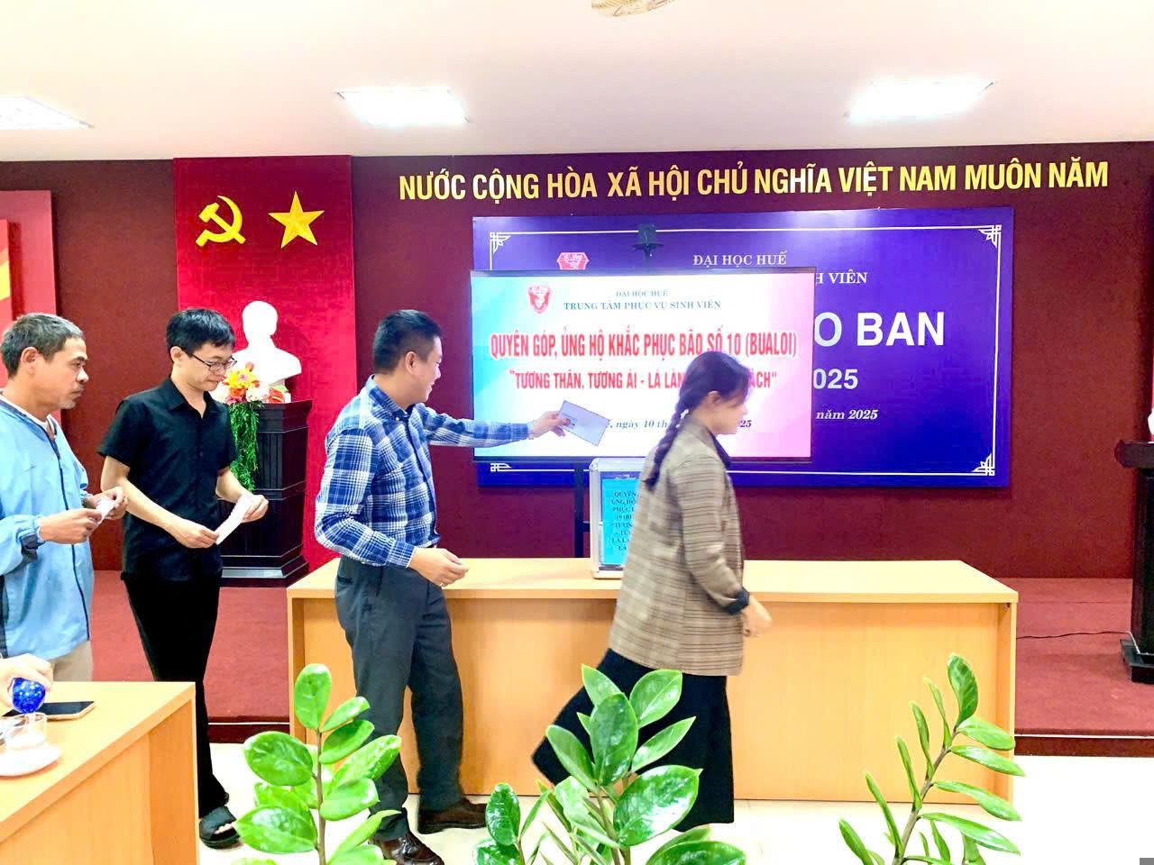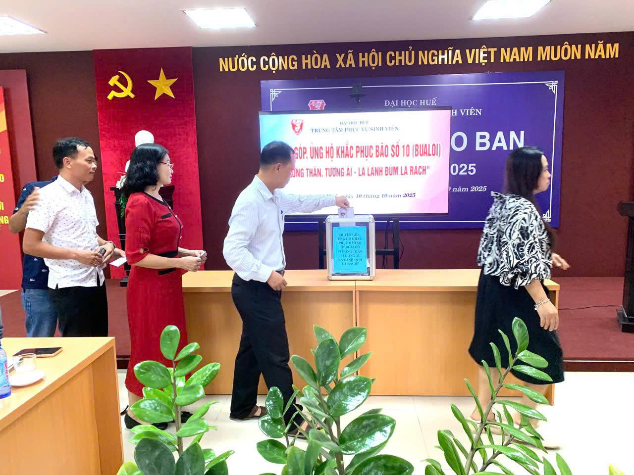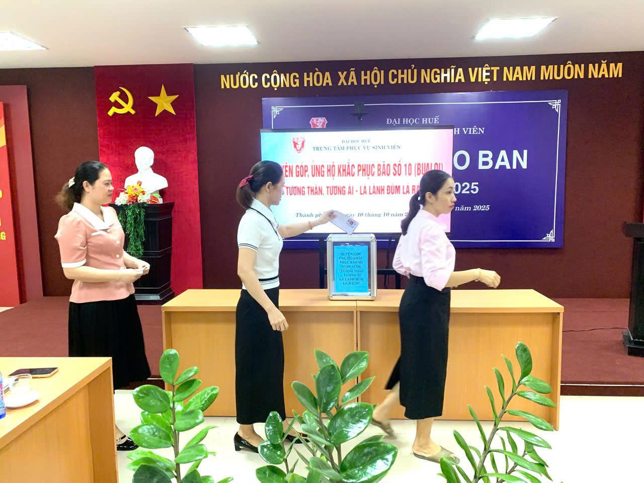 Hưởng ứng lời kêu gọi của Ủy ban Trung ương Mặt trận Tổ quốc Việt Nam, Bộ Giáo dục và đào tạo, và Đại học Huế. Với tinh thần “tương thân, tương ái”, “lá lành đùm lá rách”, cùng cả nước hướng về các tỉnh, thành phố khu vực Bắc Bộ và Bắc Trung Bộ, hướng về đồng bào, nhà giáo, người lao động và học sinh, sinh viên (NG, NLĐ và HSSV) chịu thiệt hại do bão lũ gây ra. Ngày 10/10/2025 Trung tâm Phục vụ sinh viên – Đại học Huế tổ chức vận động toàn thể viên chức,người lao động cùng chung tay hỗ trợ để đồng bào, NG, NLĐ và HSSV vùng bão lũ ổn định tinh thần, đồng thời đóng góp kinh phí để chia sẻ khó khăn với đồng bào, NG, NLĐ, HSSV vùng bão lũ.